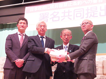 2025年11月26日 【2025年11月27日配信】禁止条約批准求め345万筆/被団協と原水協・原水禁/非核三原則見直しに抗議〈表紙写真〉被団協、原水協、原水禁の代表が外務省の軍縮不拡散・科学部審議官に、核兵器禁止条約の早期批准を求める署名(累計344万9012筆)を手渡した(左から谷雅志原水禁事務局長、安井正和原水協事務局長、濱住治郎被団協事務局長、11月21日、都内 被団協署名共同提出集会)