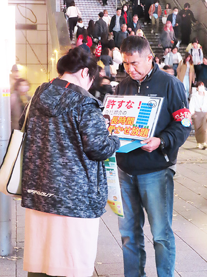 2025年11月17日 【2025年11月15日配信】労働時間規制緩和に反対/労働法制中央連絡会〈写真〉全労連や日本マスコミ文化情報労組会議(MIC)など労働法制中央連絡会は労働時間規制の緩和反対を訴える街頭宣伝を行った(11月14日、JR新宿駅前)