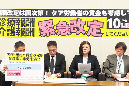 2025年11月17日 【2025年11月15日配信】診療報酬は10%以上の改定で/医療3単産が緊急会見/「改定前にも早急な手立てを」〈写真〉〈表紙写真〉日本医労連、自治労連、全大教でつくる医療三単産共闘会議は緊急会見を開き、今すぐ全てのケア労働者の処遇改善を国の責任で行うよう訴えた(11月13日、国会内)