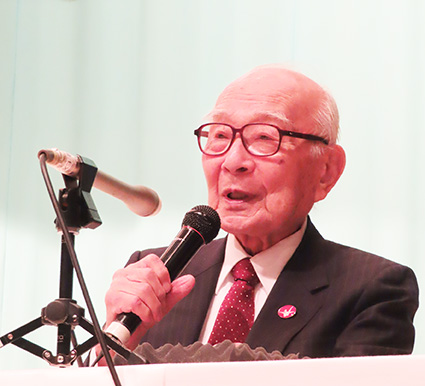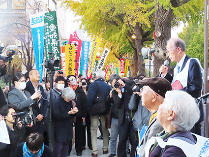 2025年11月26日 【2025年11月27日配信】禁止条約批准求め345万筆/被団協と原水協・原水禁/非核三原則見直しに抗議〈写真〉被団協の田中照巳代表委員は政府の非核三原則の見直し検討に言及し、「非常に由々しきことだ。今の政府を何とかしなくてはいけない」(11月21日、都内 被団協署名共同提出集会)