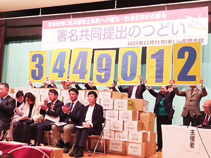 2025年11月26日 【2025年11月27日配信】禁止条約批准求め345万筆/被団協と原水協・原水禁/非核三原則見直しに抗議〈写真〉日本政府に核兵器禁止条約批准を求める署名345万筆が舞台に積み上げられていた(11月21日、都内 被団協署名共同提出集会)