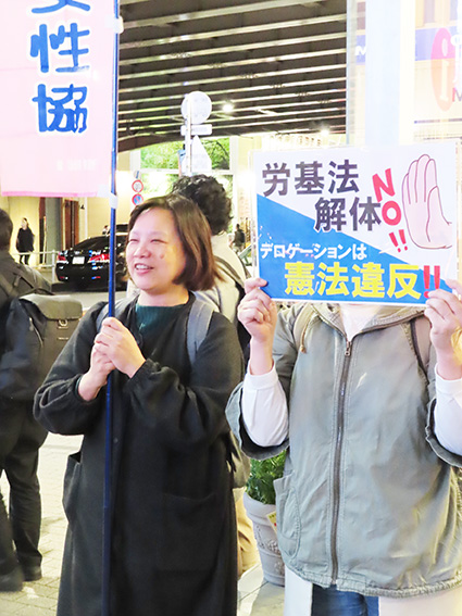 2025年11月17日 【2025年11月15日配信】労働時間規制緩和に反対/労働法制中央連絡会〈写真〉労働時間規制の緩和反対を訴える街頭宣伝ではさまざまなプラカードも掲げてアピールした(11月14日、JR新宿駅前)