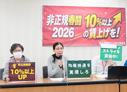 2026年2月10日 【2026年2月10日配信】組合に入り賃上げ交渉しよう/非正規春闘実行委/ベアと総収入増を求める〈写真〉東京都内の自治体で会計年度任用職員として働く組合員が都内23区と三多摩地域の自治体との賃金格差を訴えた(中央、2月2日、都内 非正規春闘実行委の会見)