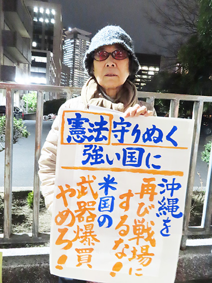 2026年2月16日 【2026年2月14日配信】官邸前に市民ら400人/衆院選の結果受け急きょ開催〈写真〉「沖縄を二度と戦場にさせない」(2月10日、首相官邸前)